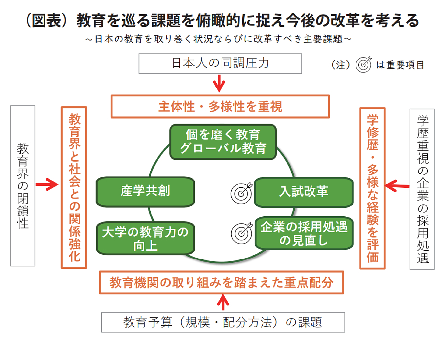 一つ目は、初等中等教育の改革である。自ら課題を見つけ、解決策を導き出し新たな価値を創造する人材の育成に向けて、一律一斉型の教育から、多様性・好奇心・探究力を中心に個を磨き育む教育に転換する必要がある。学校教育では、個々の興味・関心や学習進度を踏まえた個別最適な学びを提供するために、教員が教育指導に集中できる環境の整備や、企業等で多様な経験を持つ人材の学校現場への参画が不可欠である。また、基礎学力に加えて好奇心や探究力を総合的に評価する入試への改革や、専門高校等における産業人材の育成とその魅力の向上も大切である。