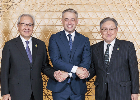 ガフコフスキ副首相(中央)、髙島副会長(左)、東原副議長(右)