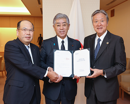岩屋大臣(中央)、西澤副議長(右)、清水部会長(左)