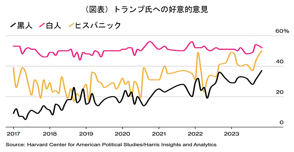 かくしてマイノリティのなかでも、トランプ氏への好意的な意見が増えてきた。それは17年8月のシャーロッツヴィル事件や20年5月のジョージ・フロイド事件など、白人至上主義と批判された事件の後でも支持が緩やかに増えていることから分かるだろう(図表参照)。