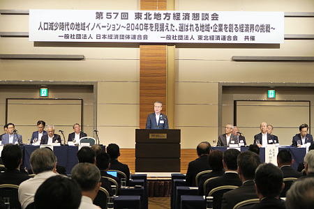 経済懇談会の開会あいさつで東経連の増子会長は、東北・新潟地域の強みとして、世界に誇れる観光資源、魅力ある農水産物、進展中の各種科学技術プロジェクトなどを指摘。こうした強みを生かし、イノベーションや高付加価値型産業の創出、地方への新たな人の流れを呼び起こしていきたいと述べた。