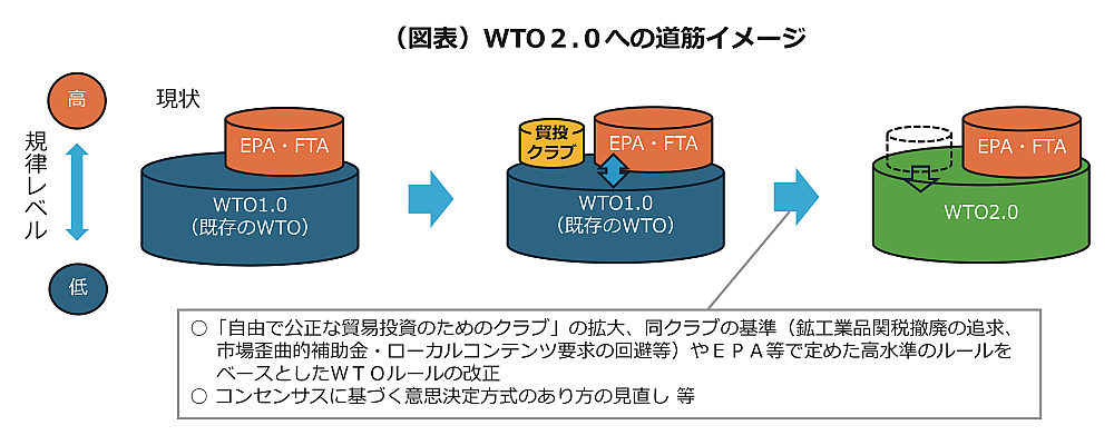 同クラブは、一定のハイレベルな貿易投資の基準を満たす有志国により形成される。そのうえで、同クラブがその基準や経済連携協定(EPA)等で定められた高水準のルールをWTO協定に取り込むという触媒機能を果たすことで、既存のWTO(WTO1.0)を高度化する。