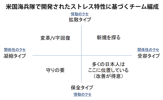 これは徹底した現場主義と創造性の発揮を特徴とする米国海兵隊が、より良いチーム作りのため、各人が適度なストレス状態にあるようにする一方で「何が適度なストレスになるかは人によってかなり特性が異なる」ということを踏まえたチーム編成を開発した(図表参照)。
