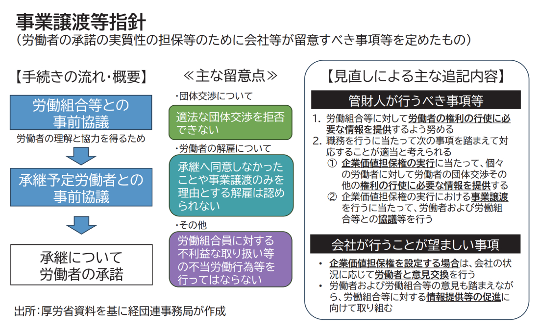 そこで労働者保護の観点から、事業性融資推進法の審議に際する国会の附帯決議では、事業譲渡等指針に関し、企業価値担保権の創設を踏まえた必要な見直し等を行うこととされた。