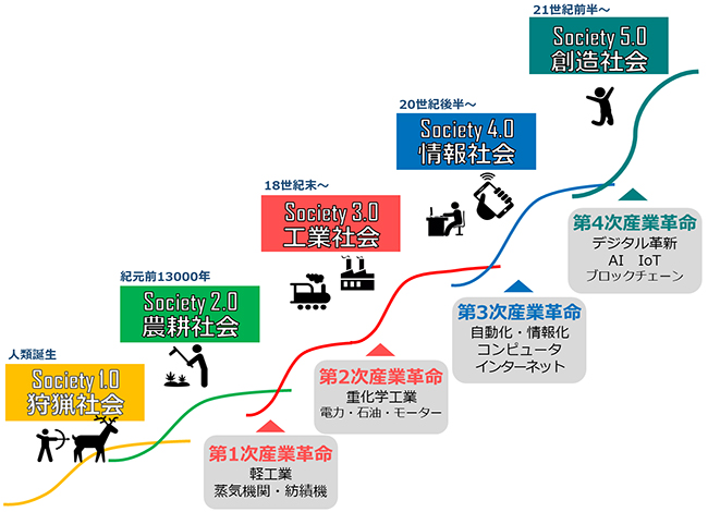こうした変革の先にわが国が目指す未来社会像として、「第5期科学技術基本計画」(2016年1月)で提起されたコンセプトが「Society 5.0」であり、昨年制定の「第6期科学技術・イノベーション基本計画」(2021年3月)でもその概念は重ねて強調された。経団連でも、提言「Society 5.0」(2018年11月)において、「Society 5.0とは、“創造社会”であり、『デジタル革新と多様な人々の想像・創造力の融合によって、社会の課題を解決し、価値を創造する社会』である。人間だけでなく自然や技術にも想像をめぐらし、共生の道を探ることで、持続可能な発展を遂げていく」と定義し、さらに「。新成長戦略」(2020年11月)では2030年の未来像とアクションを示した。本提言では、「Society 5.0(創造社会)」へ本格的に移行すると考えられる、2030年~2040年頃の社会に向けた産業技術競争力の強化策について、キー・テクノロジーの観点から検討を行うこととする。