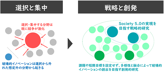 研究開発の方向性として、「選択と集中」から「戦略と創発」へと発想を転換する必要があることは、これまで繰り返し主張してきた通りである。創発を促す視点で創設された「創発的研究支援事業」は、自由で挑戦的・融合的な研究を長期にわたって支援する取り組みであり、今後も推進と拡充を続けるべきである。