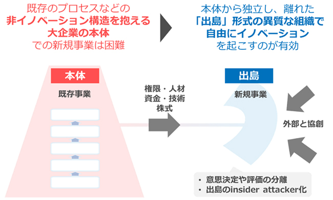 その方策として、本体から独立し、意思決定や評価を分離した異質な文化や制度を有する組織において、外部との協創を行いながら自由にイノベーションを起こす「出島」形式は引き続き有効であり、更なる推進を図るべきである。