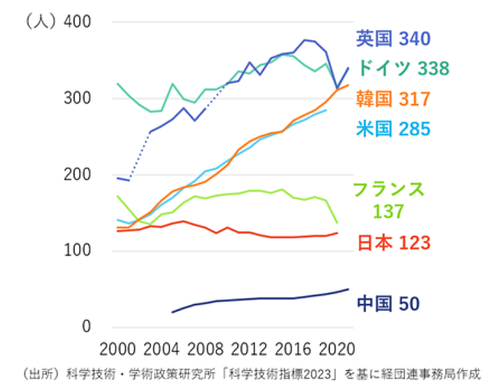- 人口100万人あたりの博士号取得者数で比較すると、米国285人に対し日本は123人。