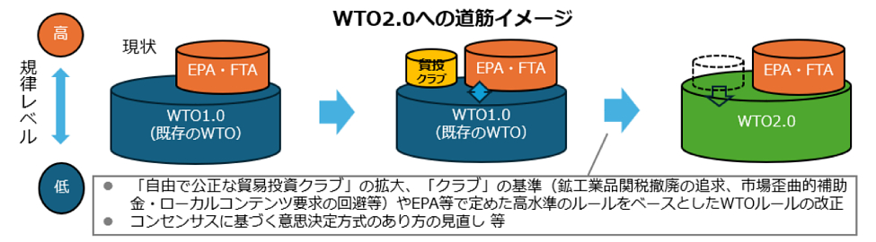 以上から明らかなとおり、また、下図に示すように、クラブはWTOにとって代わるものではなく、WTO1.0からWTO2.0への改革・移行を促す触媒の役割を果たすことを想定したものである。クラブは排他的なものではなく、むしろ参加国・地域が拡大していくことを目指しており、その基準がWTO2.0に反映されることになれば、WTO2.0のメンバーには均霑される。
