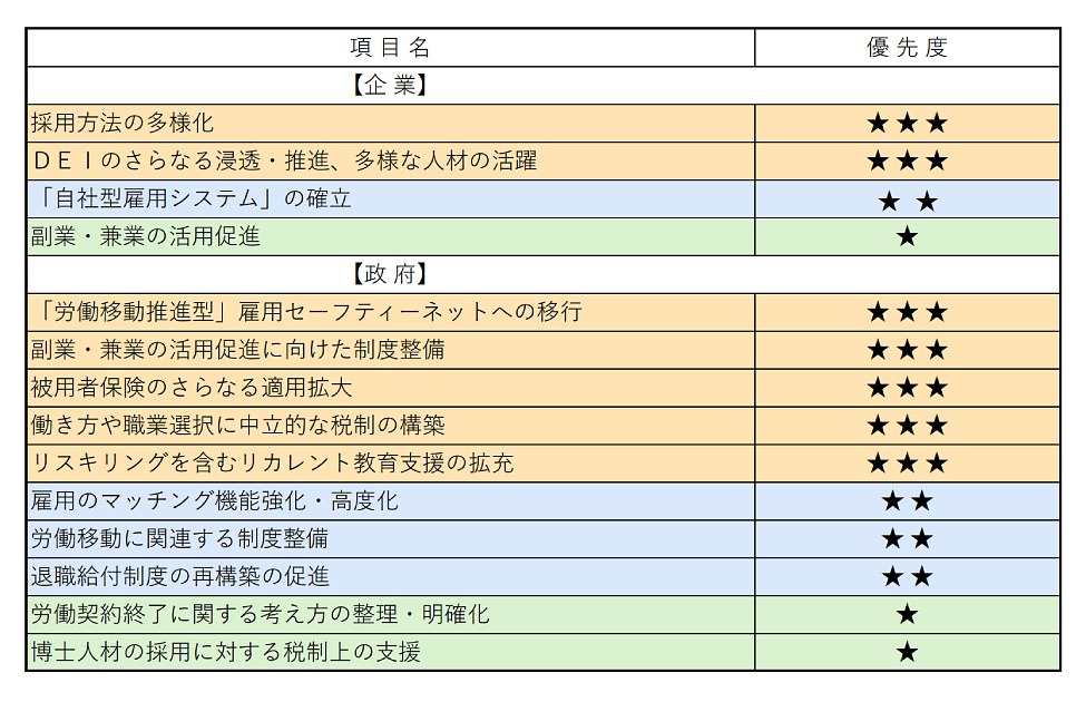 わが国における労働移動の現状を踏まえ、今後、労働移動の積極的な推進による労働生産性の向上を実現すべく、これまで各年版「経営労働政策特別委員会報告」等で指摘した①企業・経済界が取り組む事項、②政府に要望する事項、③教育機関との連携事項について、優先度を示しながら整理する。