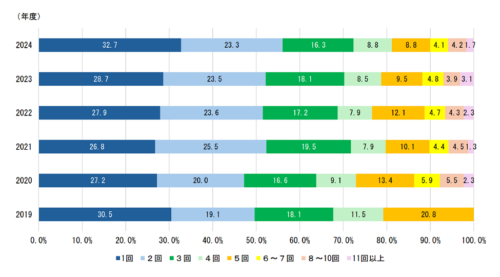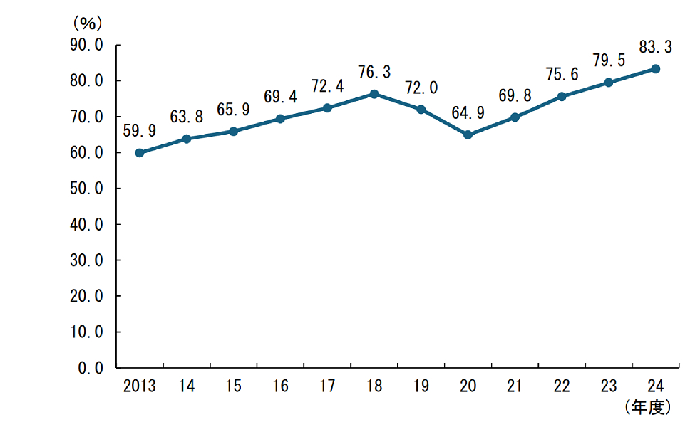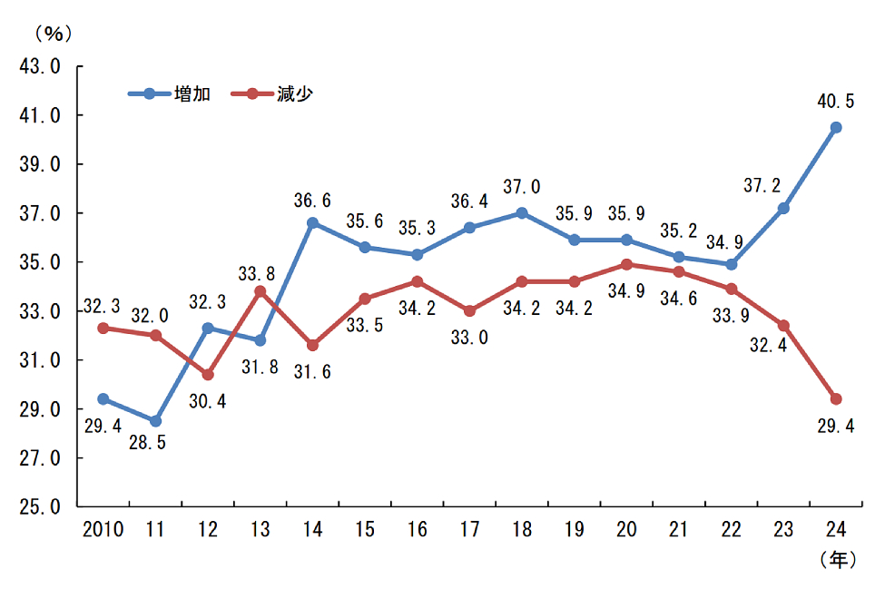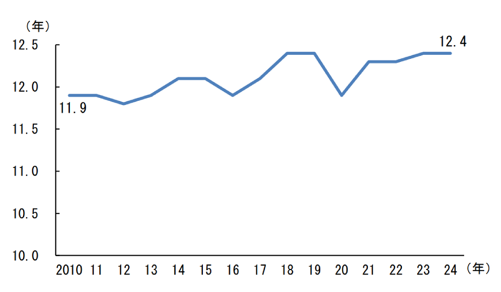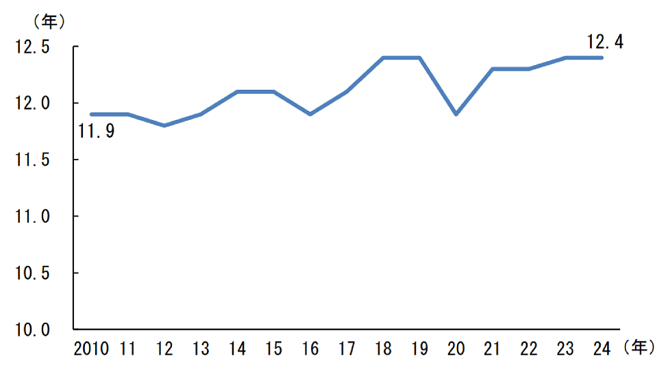勤続年数(一般労働者)の推移を確認すると、長期的に上昇傾向にあったが、コロナ禍等により2020年に大きく低下した後に再び上昇し、2024年はコロナ前の2019年と同水準となった(2010年11.9年→2014年12.1年→2019年12.4年→2020年11.9年→2024年12.4年)。