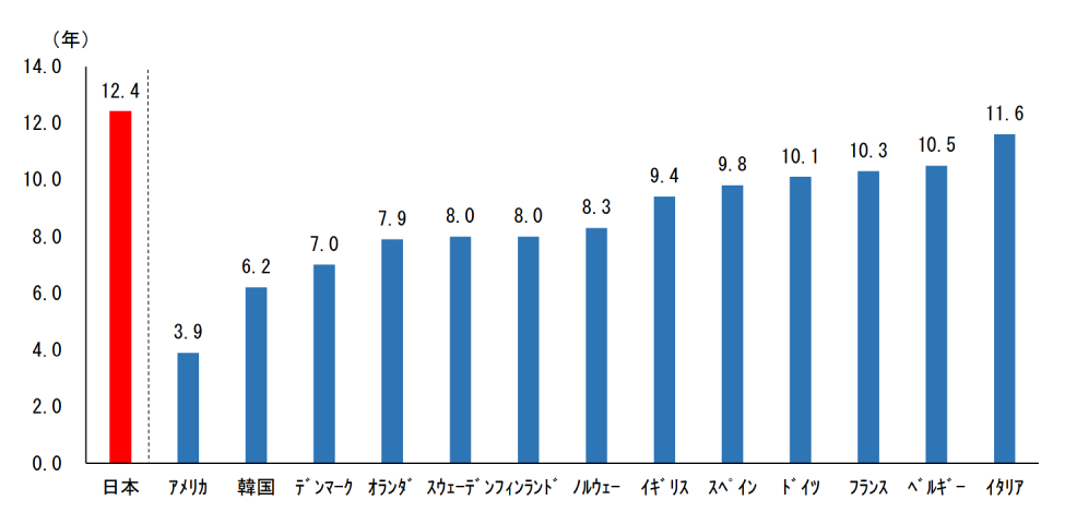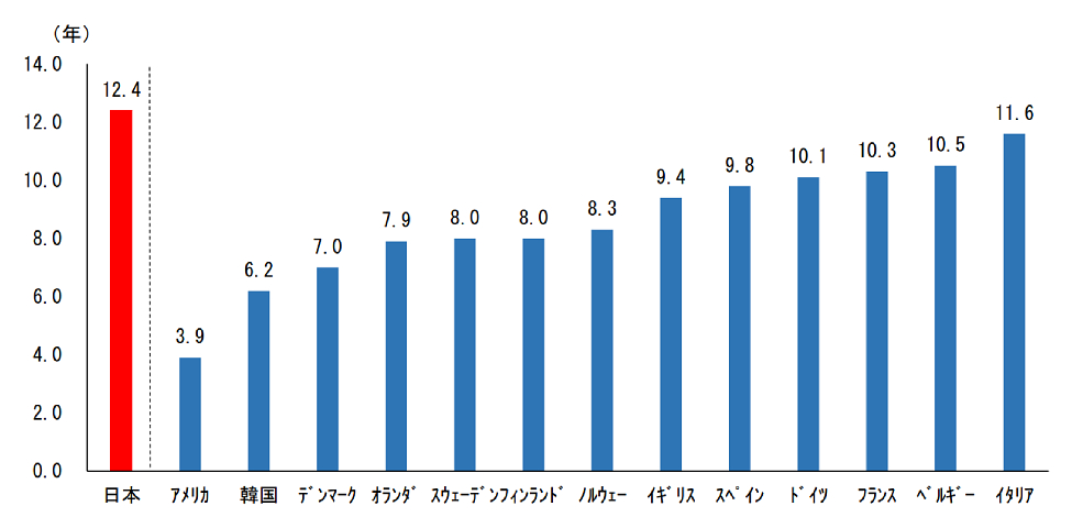 国際比較すると、日本の平均勤続年数(2024年12.4年)は他の主要国より長い(アメリカ3.9年、韓国6.2年、イギリス9.4年、ドイツ10.1年、フランス10.3年)。