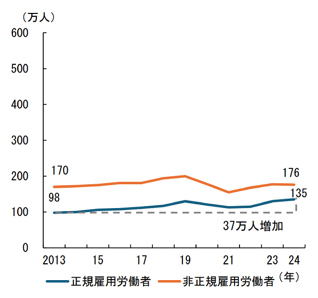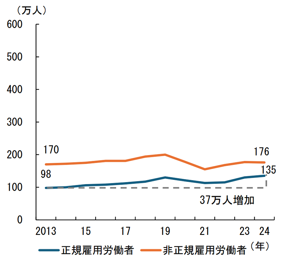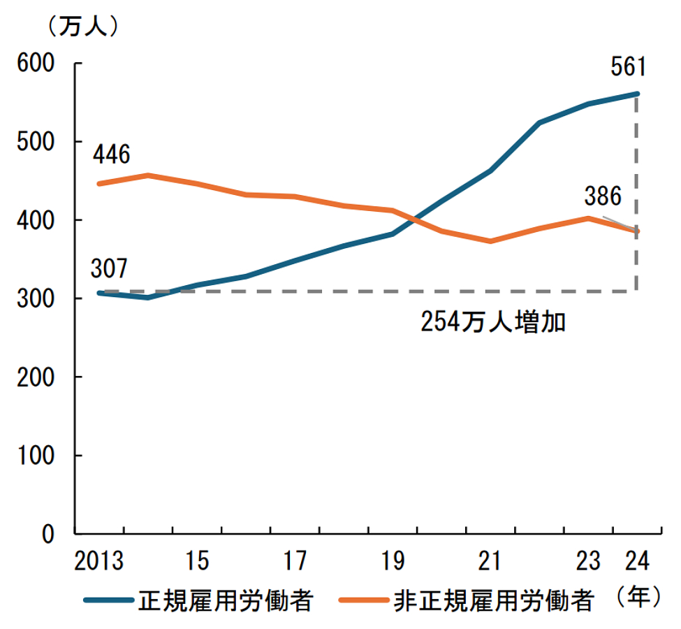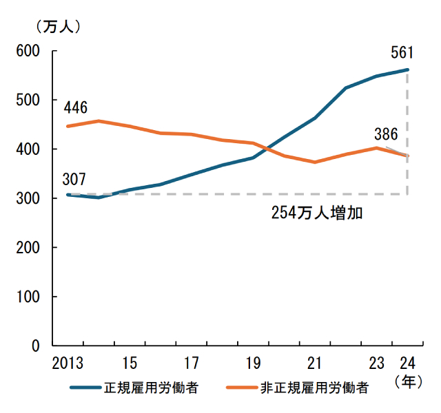 転職希望者数の動向をみると、正規雇用労働者は2013年307万人から2024年561万人(254万人増)に大幅に増加した一方、いわゆる非正規雇用労働者は同446万人から同386万人(60万人減)に減少した。