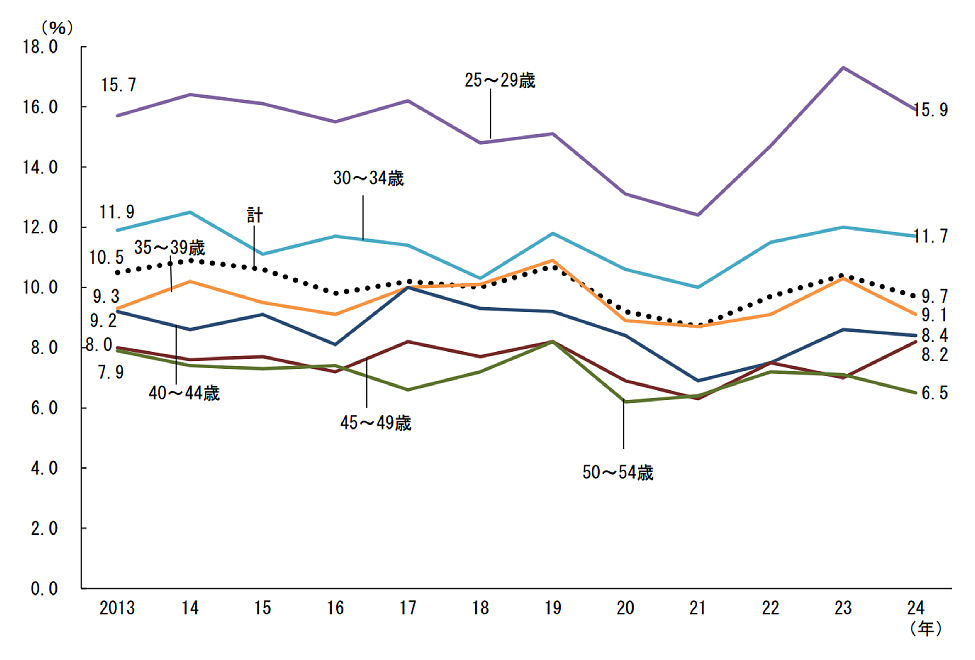 転職入職率は、全年齢階級でほぼ横ばいで推移し、若年層ほど水準が高い傾向にある。2024年の転職入職率で確認すると、25~29歳(15.9%)と30~34歳(11.7%)が全体(9.7%)を上回った一方、35~39歳(9.1%)や40~44歳(8.2%)、50~54歳(6.5%)など、35歳以降の年齢階級は全体を下回っている。
