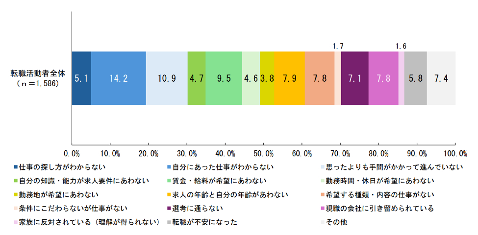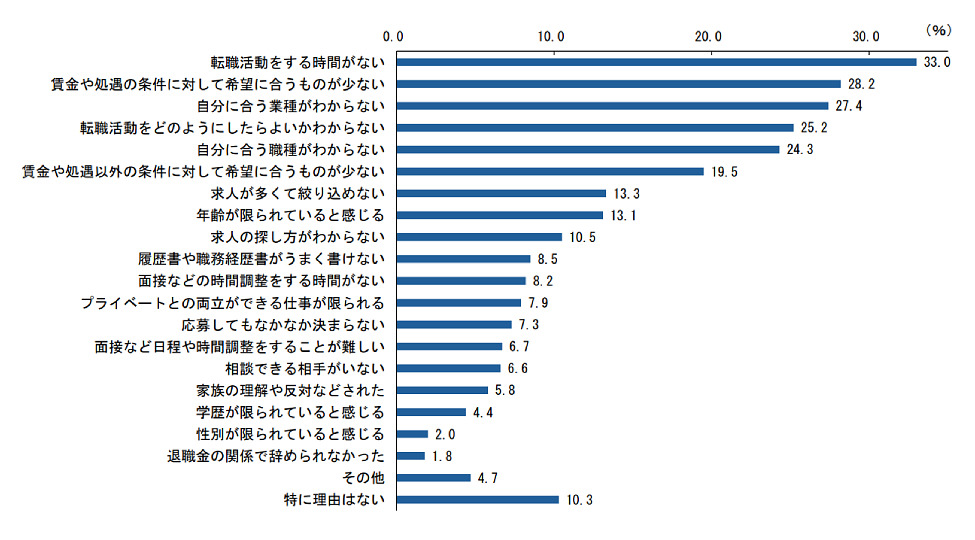 転職活動はしたが転職しなかった理由(複数回答)では、「転職活動をする時間がない」(33.0%)や「賃金や処遇の条件に対して希望に合うものが少ない」(28.2%)、「自分に合う業種がわからない」(27.4%)、「転職活動をどのようにしたらよいかわからない」(25.2%)などの回答が多い。